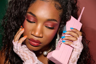 A close up of a model wearing 80's style accessories with orange nail polish on one hand and blue on the other