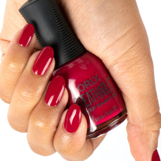 Close-up of red Orly Beauty nail polish being applied to a fingernail with a brush in smooth, even strokes.