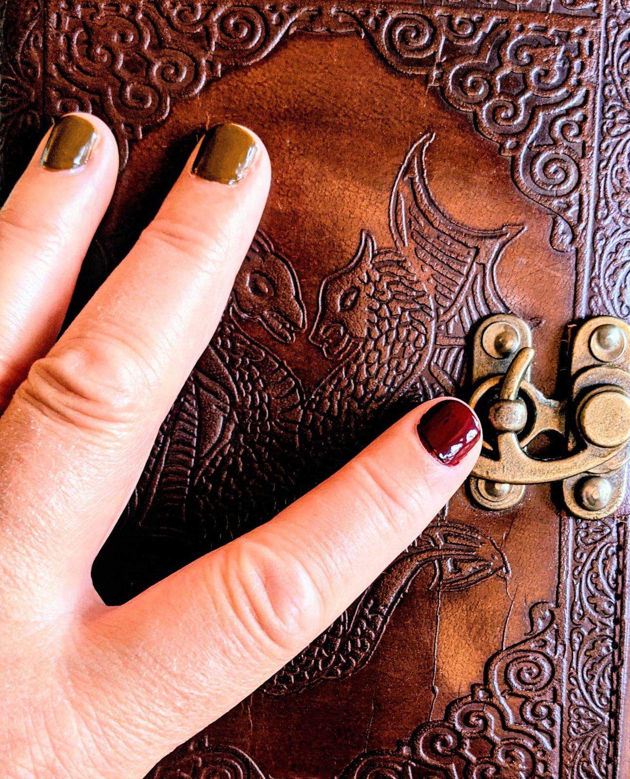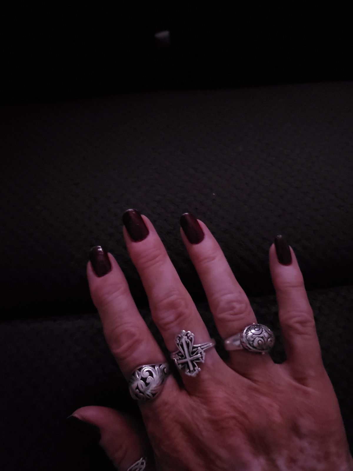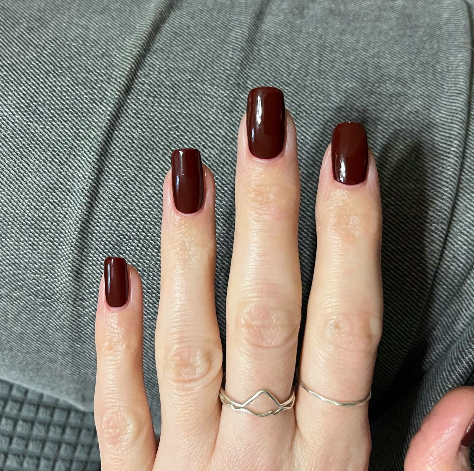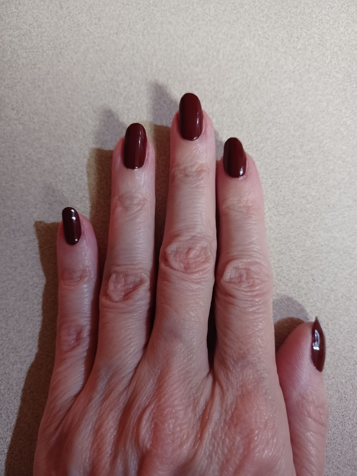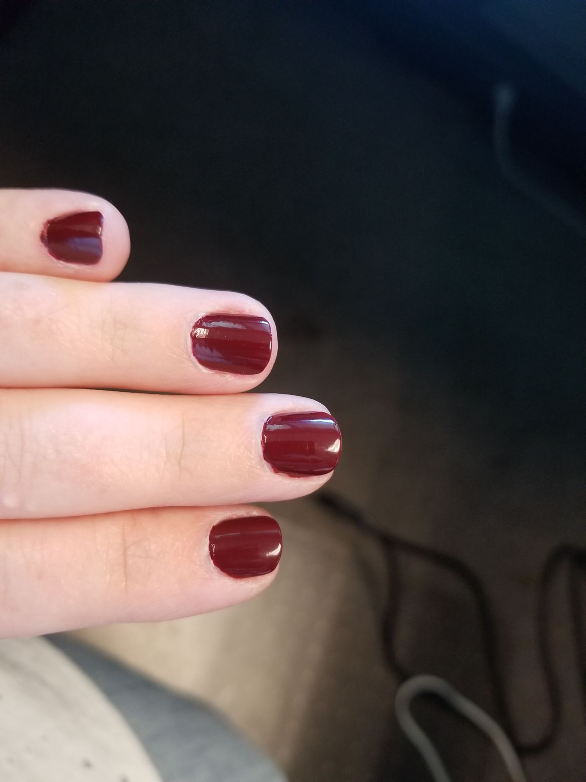 Pretty. Leans towards a mildly brownish red for me, not maroon, but more like dark cherries with a little bit of chocolate. This is one coat of color (prepped with Orly Nail Defense and a single topcoat) on my natural nails. Goes on thick and smooth. Looks juicy and stunning. Perfect for fall!