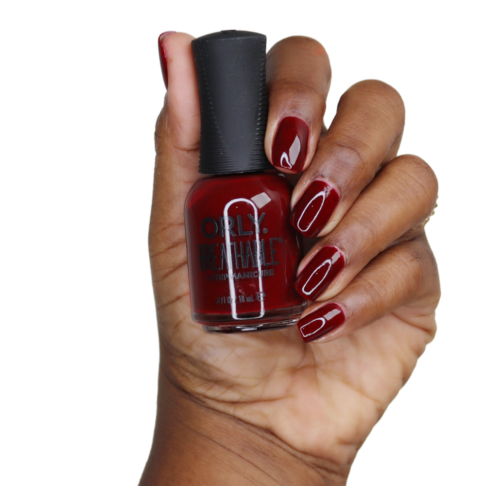 Close-up of red Orly Beauty nail polish being applied to a fingernail with a brush in smooth, even strokes.