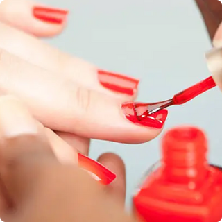 A brush applying a glossy clear topcoat over a red-painted fingernail to seal and protect the color.