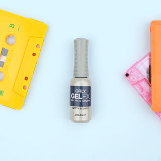 a hand with red nail polish, holding up a silver nail polish bottle and cap, with a red label with text " ORLY Gel FX", on a pink background