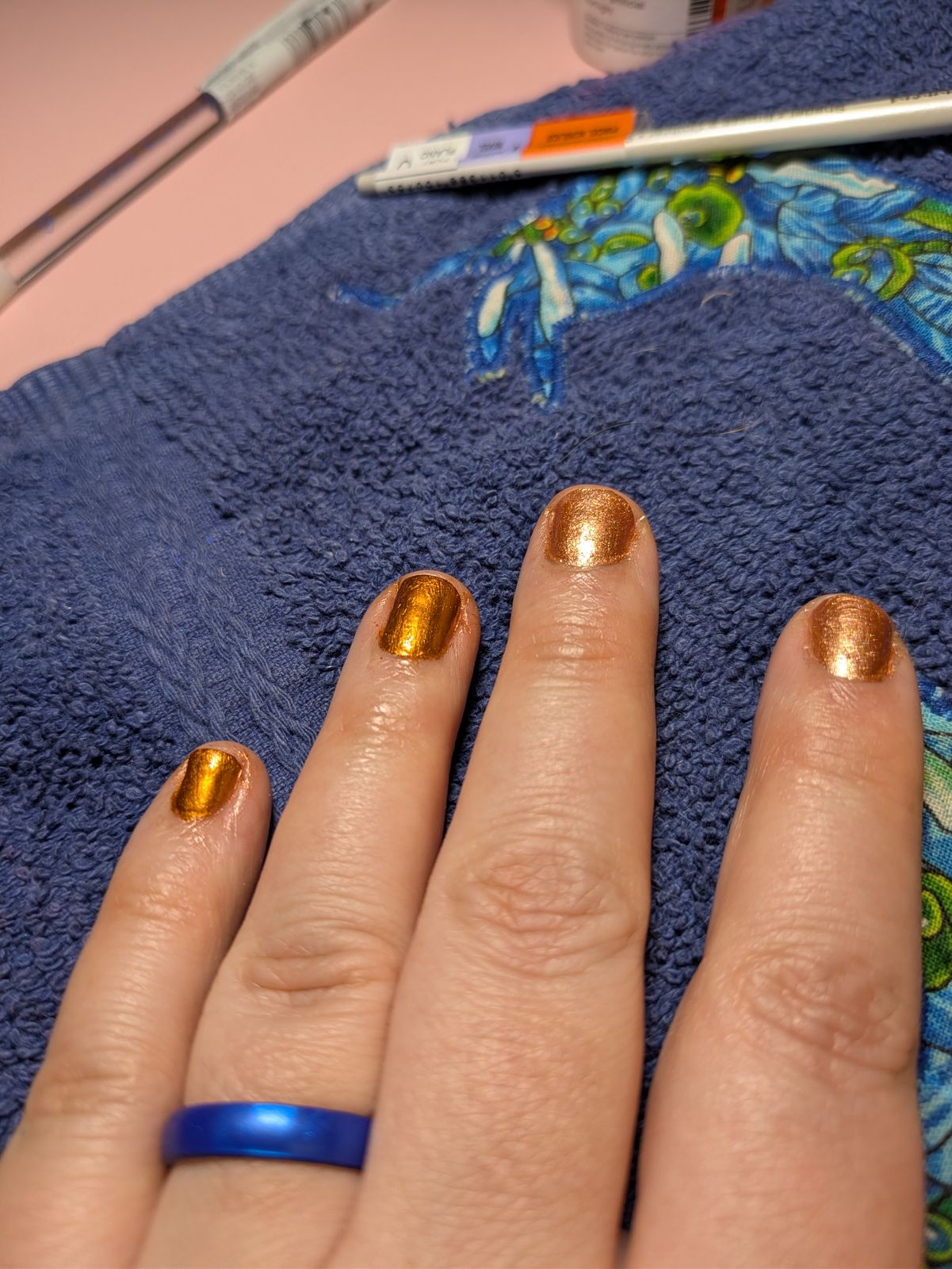 I love this simple, shimmery copper lacquer! I tipped in Lucky Penny over white and covered in Spark glamour. Love!!