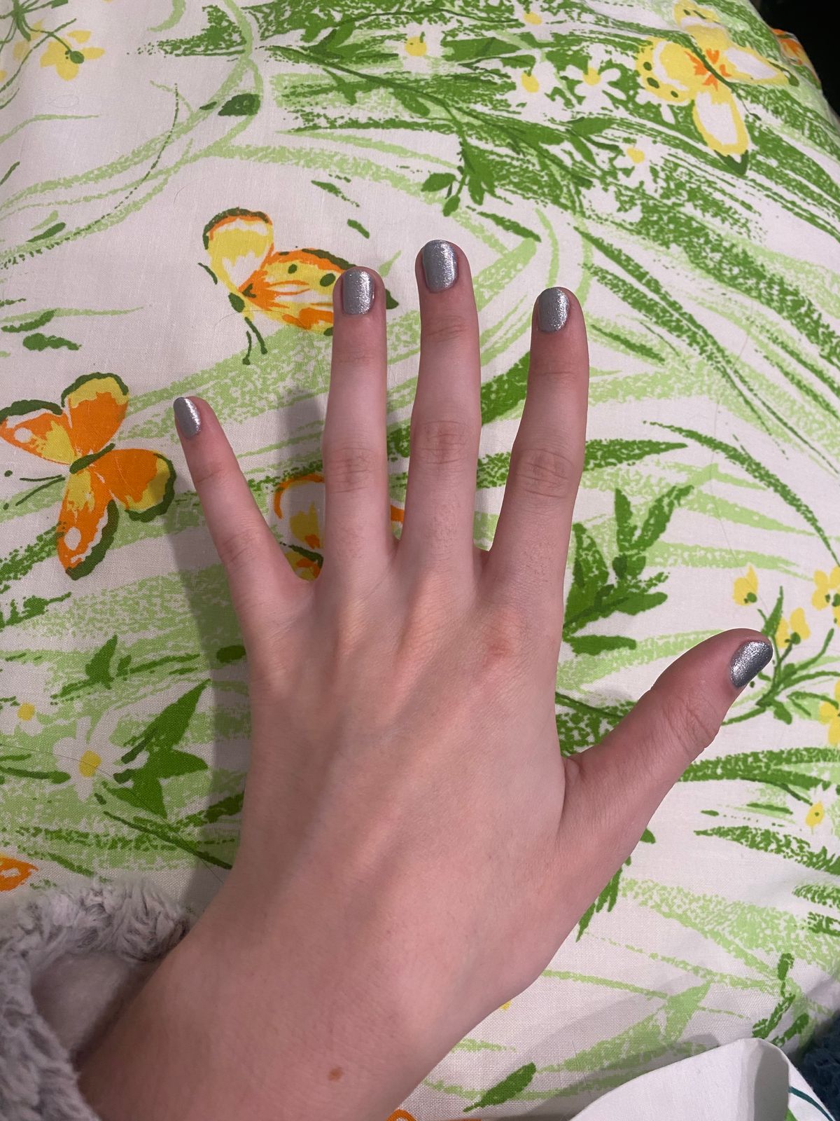 Such a gorgeous chrome silver and the added holo sparkles are the perfect touch to elevate the mani! (Ignore the quality of my mani, I’ve had this polish on for a few days now)