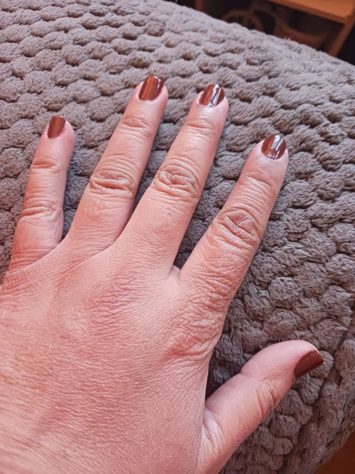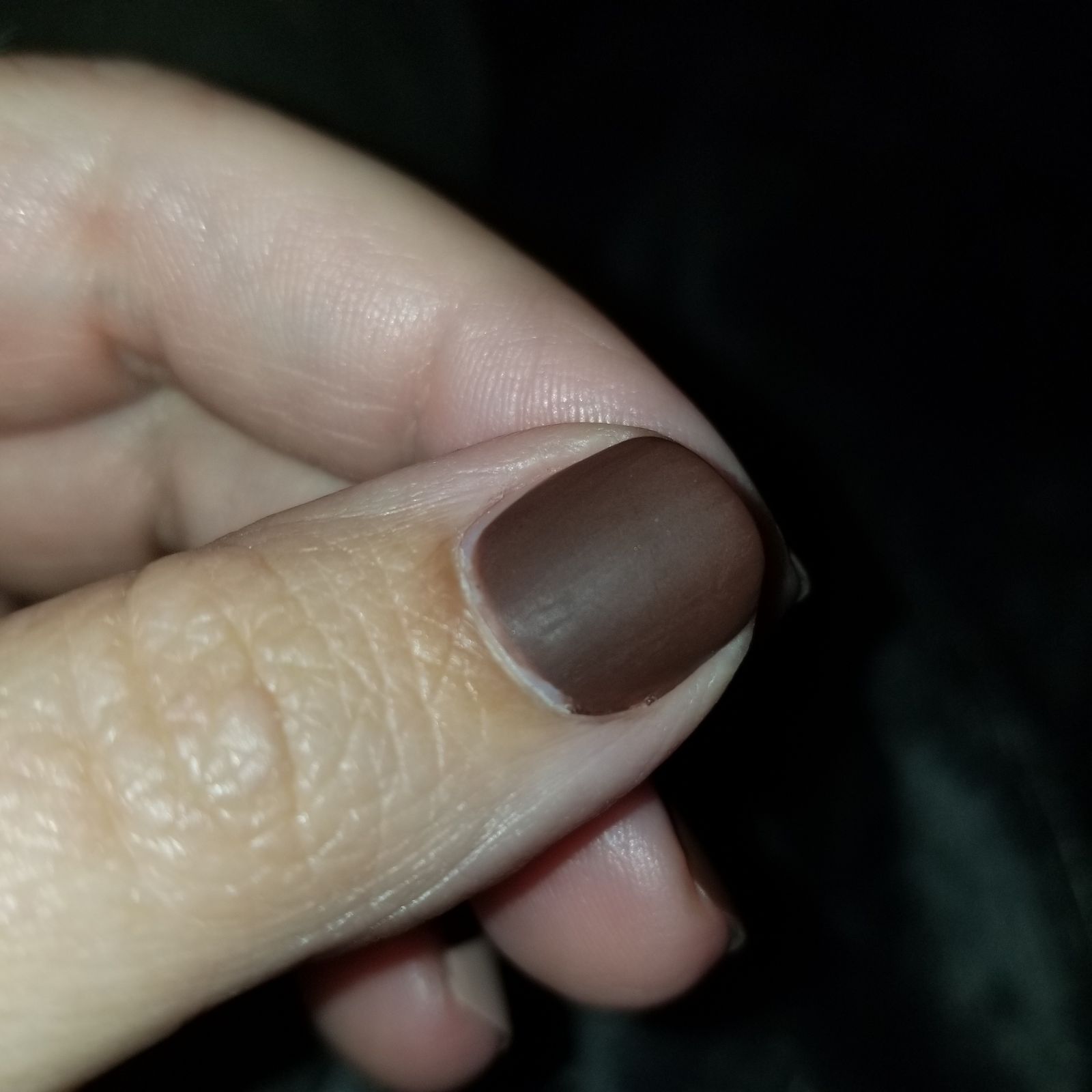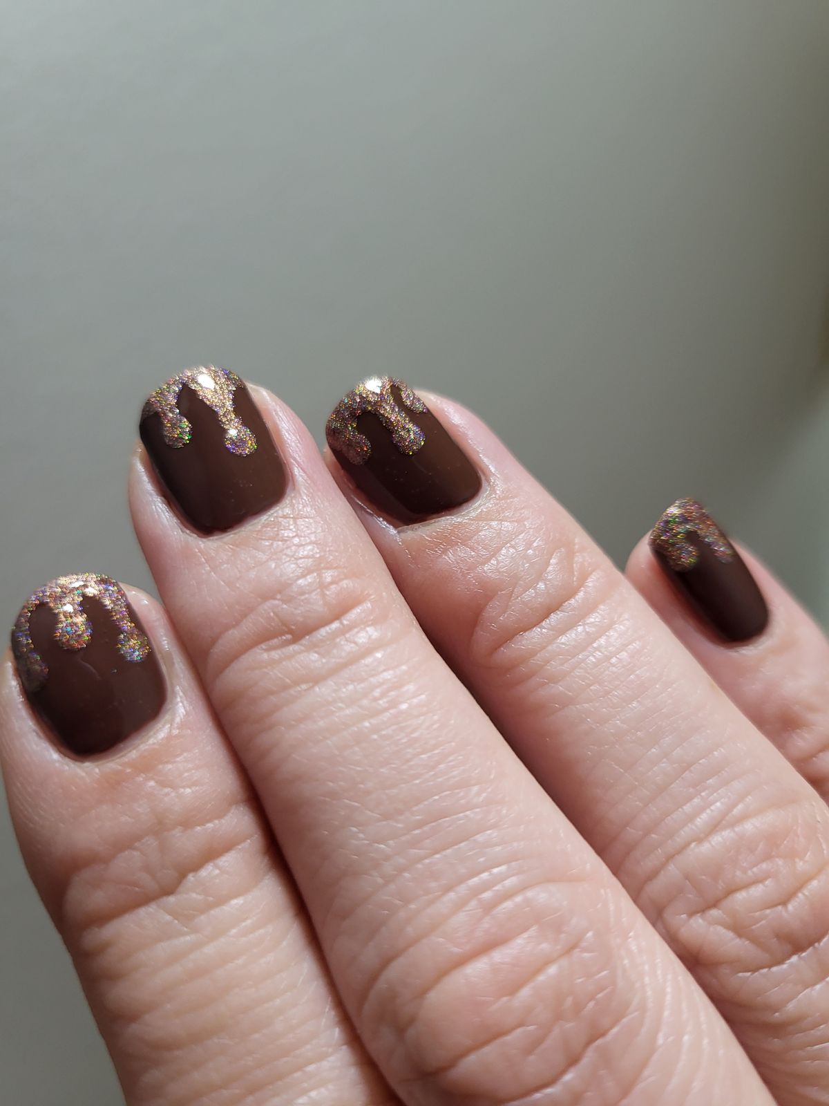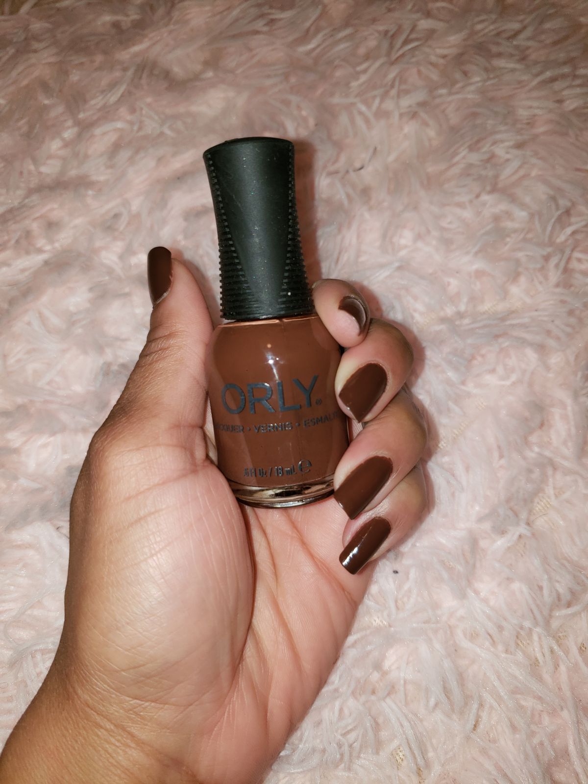 A delicious, lush chocolate brown, a great addition to any collection, and a very pretty color for fall. It took two coats for full coverage, leveled nicely, and dried glossy, but a good top coat really made it super shiny. Looks great in various lighting!