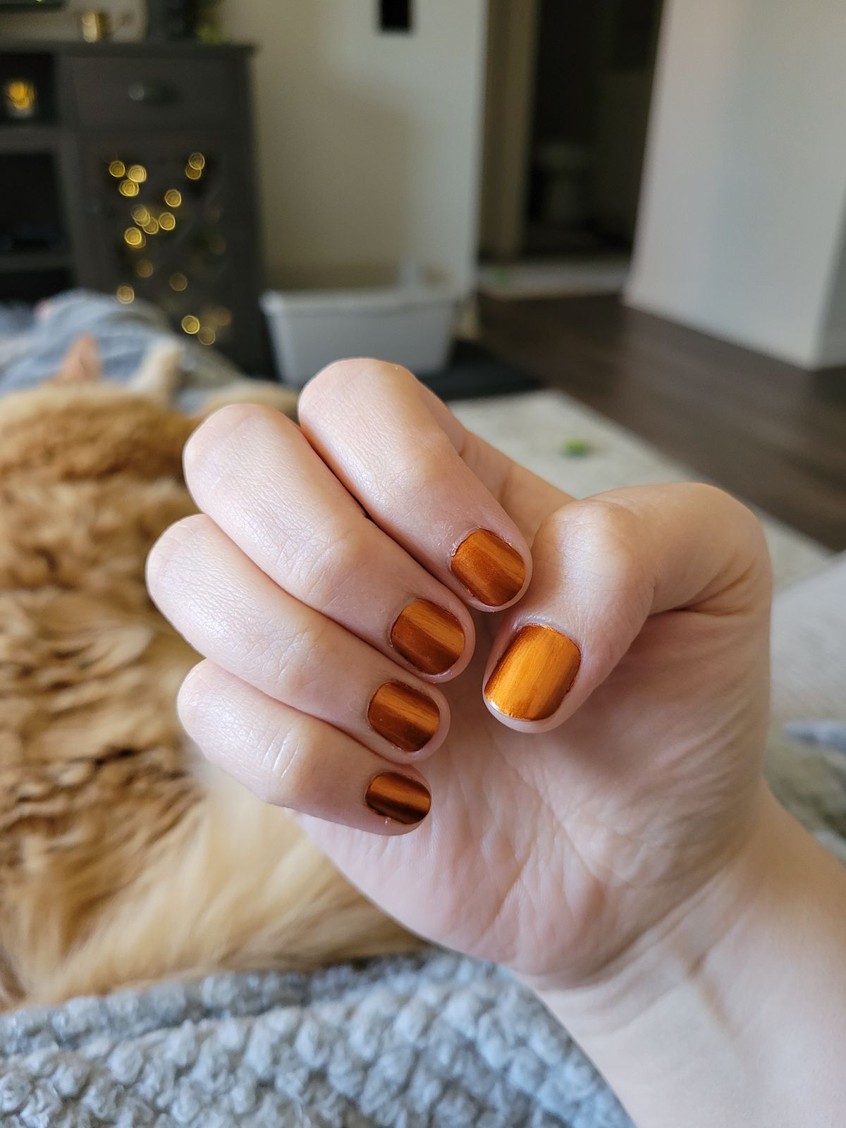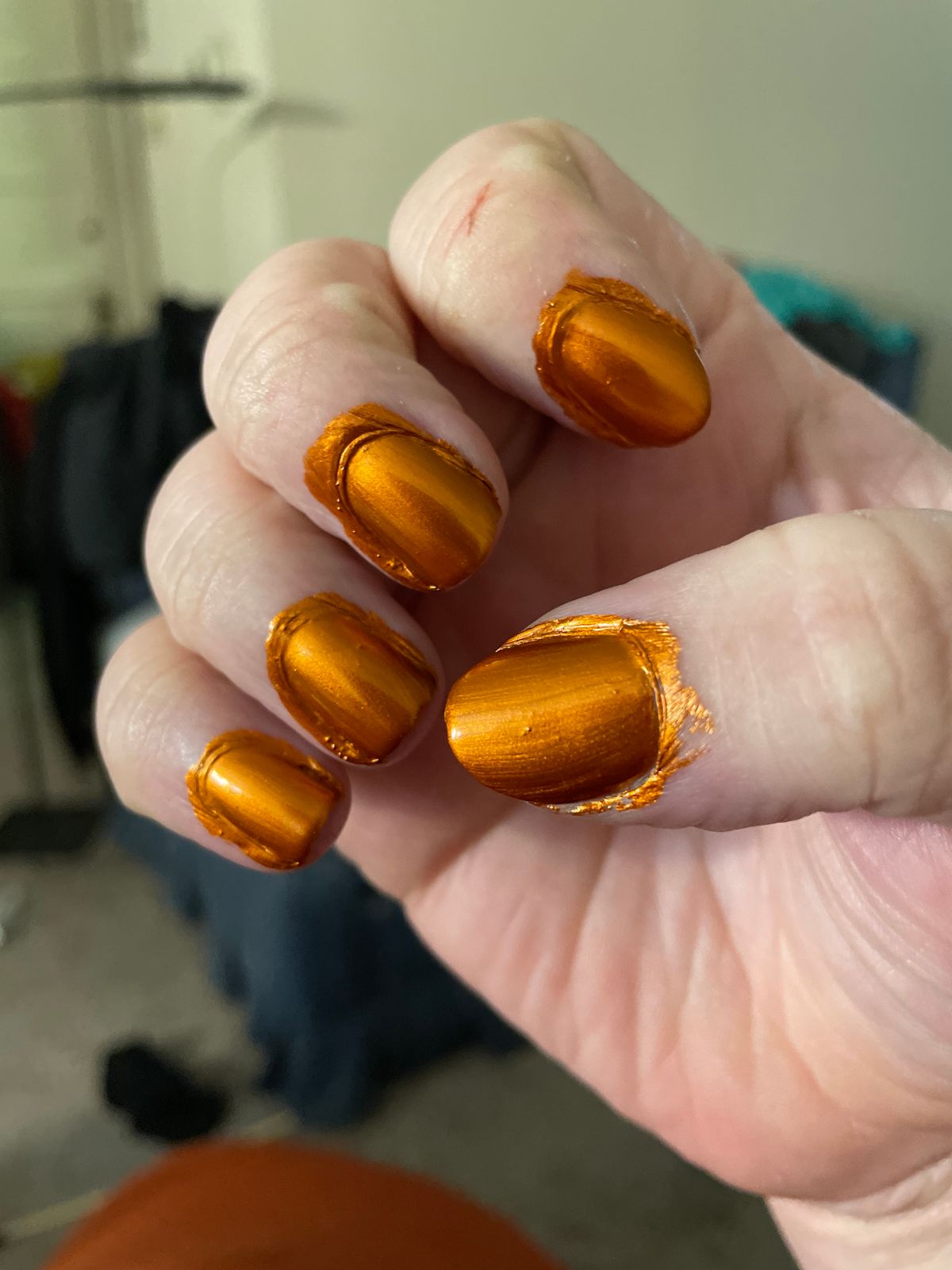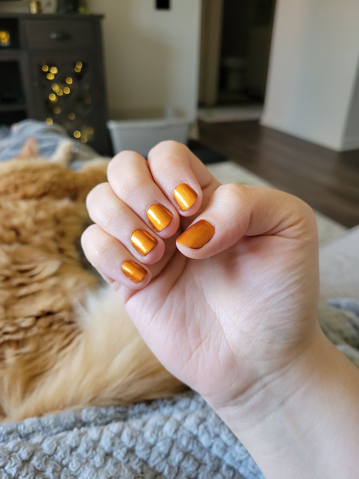 • Light My (Camp) Fire - Breathable Treatment + Color is a bright copper shimmer with gold and orange undertones, offering vibrant, fiery coverage.