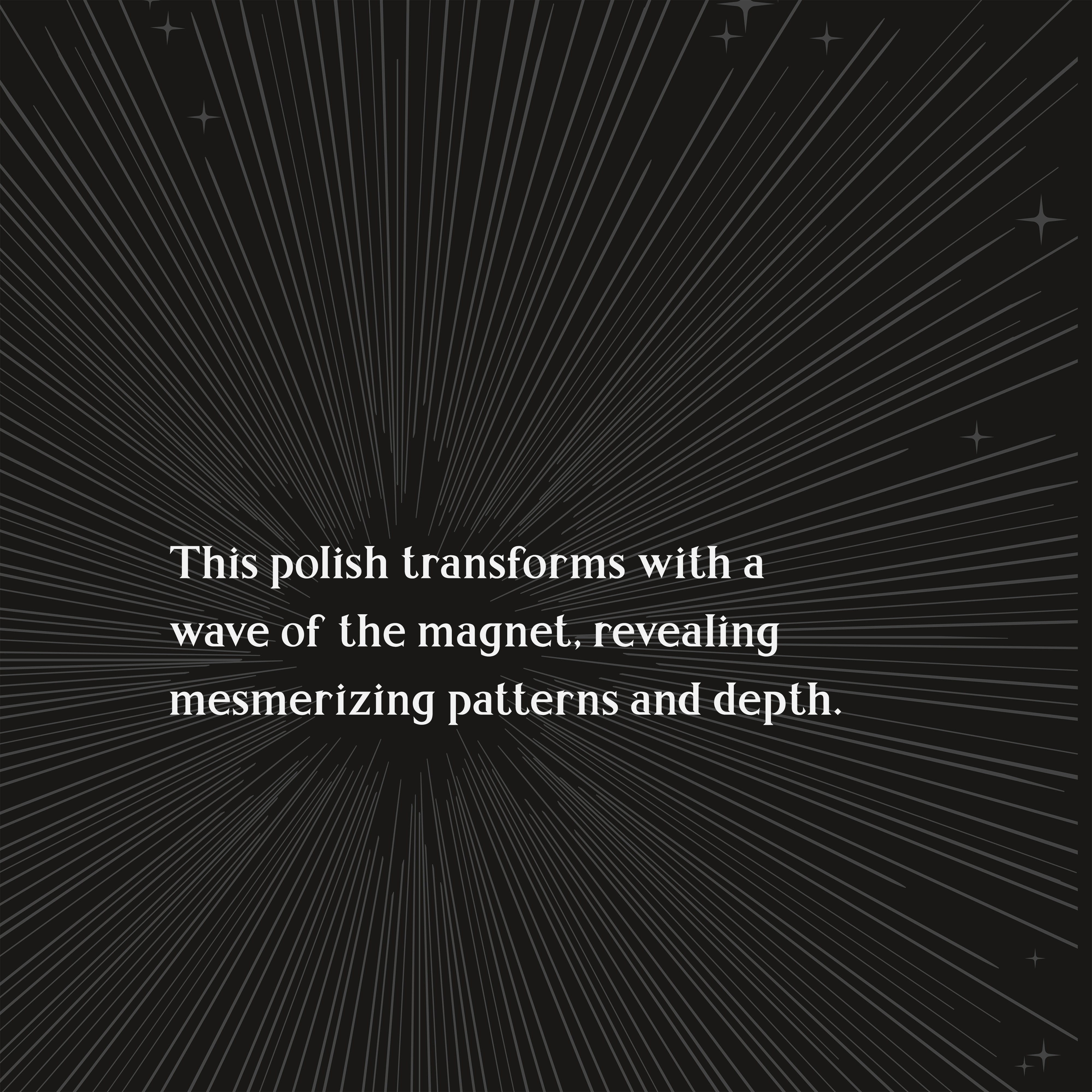 • Infused with magnetic pigments, this polish transforms with a wave of the magnet, revealing mesmerizing patterns and depth. Like magic at your fingertips, each swipe conjures an otherworldly effect.