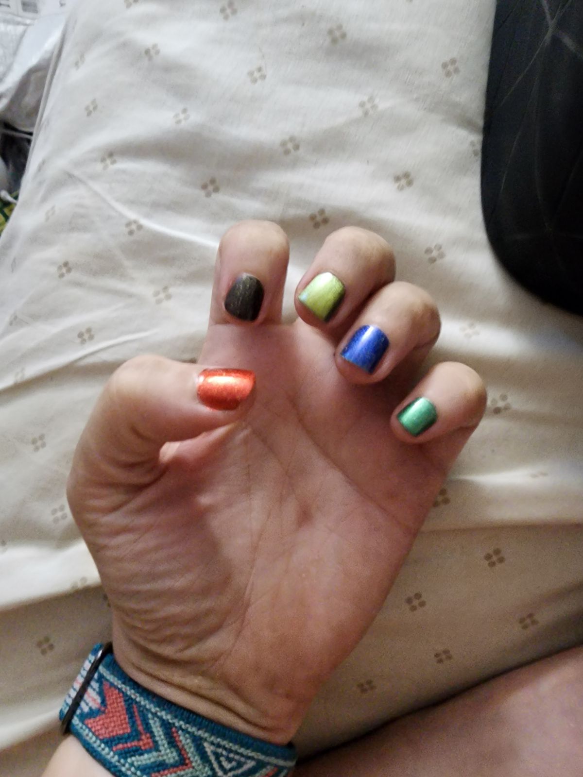 It’s a gorgeous bright green and perfect for the season. I changed it up with the bronze one and a red orange to make my fingers resemble the fall colors. I liked it.