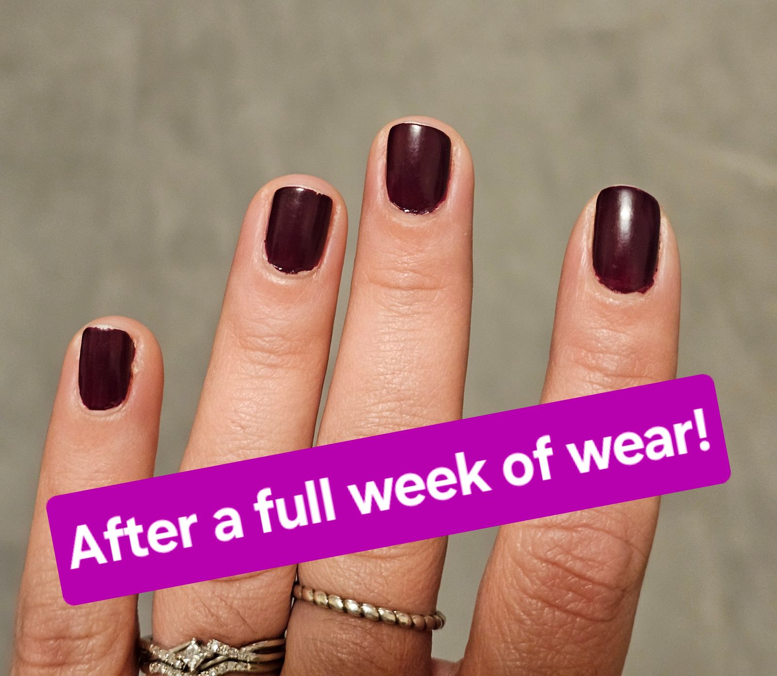 Incredible wear, no chips, no shrinking, after a full week! Paired with rubberized base coat and sec n dry top coat, both by Orly. My first time using all 3 products. Plum Noir requires 2 coats for coverage, not self-leveling. Color appears slightly darker than images advertised and darkens over time once applied. It's a beautiful rich color, perfect for cool weather.