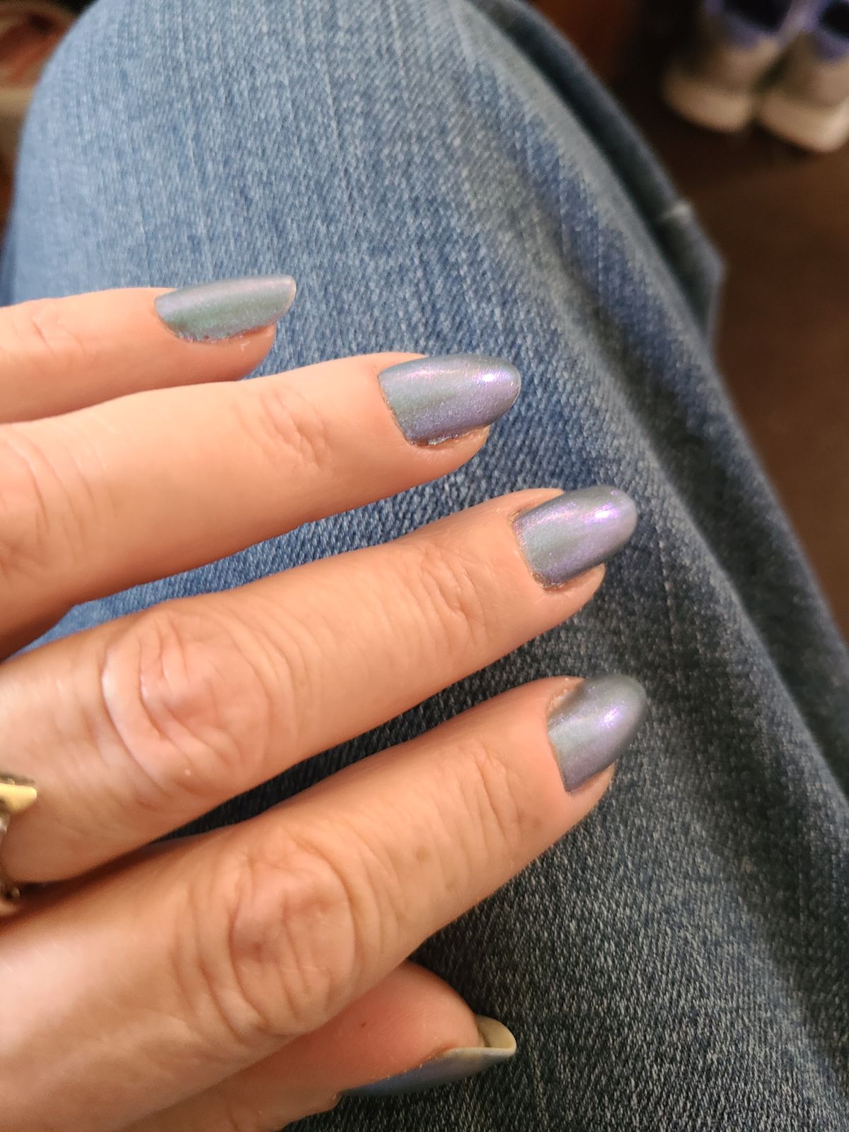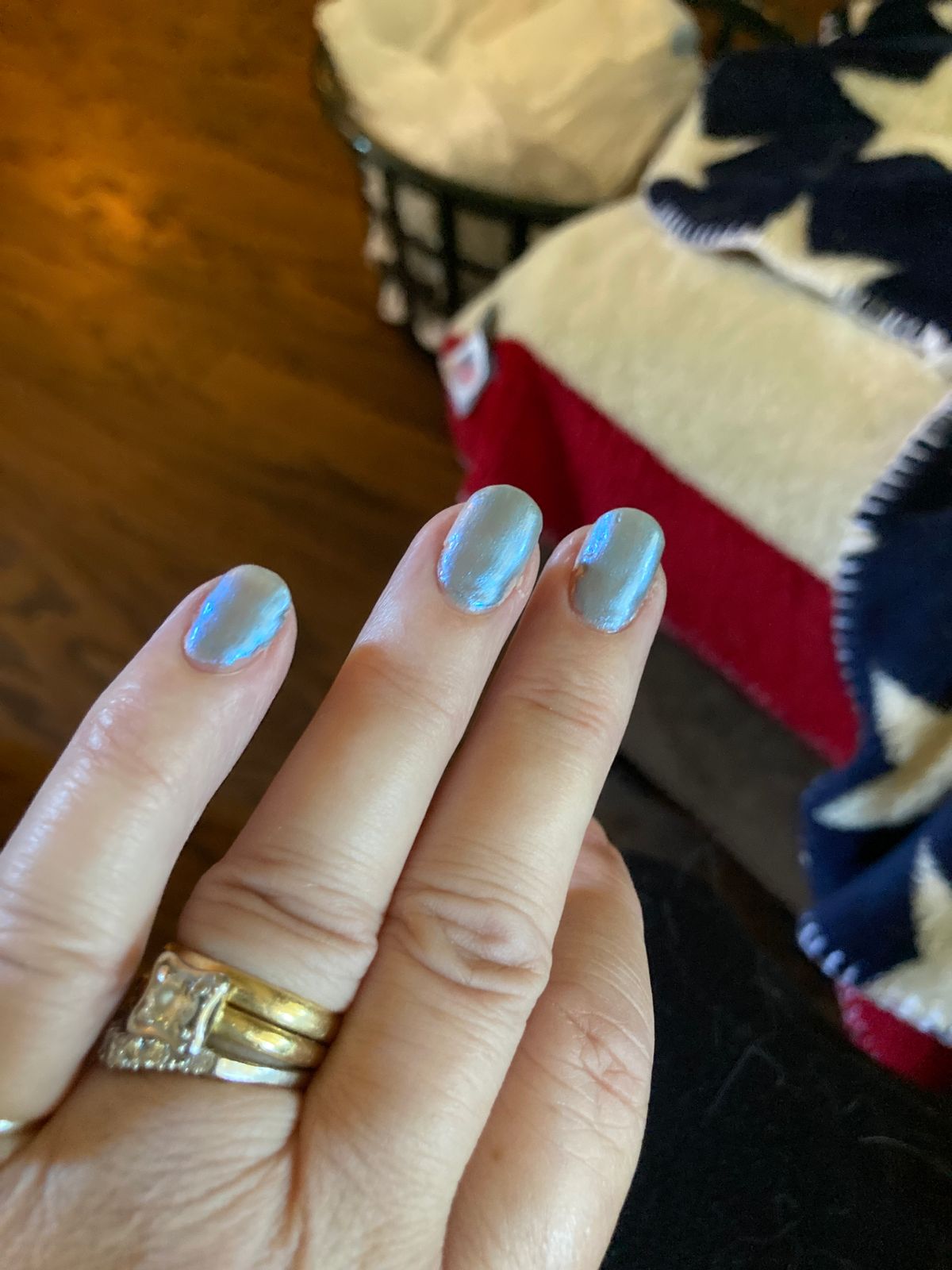 Just enough metallic pizazz to really make this color sparkle. A beautiful blue—but not TOO blue so that it is a niche color. This is a blue you can wear everyday. Just lovely.
