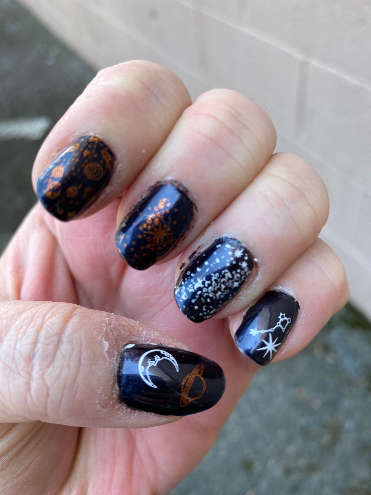 This is the best blue/black I have ever used. Just enough shimmer to create a bit of movement or texture but not overwhelming glitter. I used it as a base for solar system stamping and it turned out beautifully. I’ve never liked true black on my hands but I really like this one ❤️