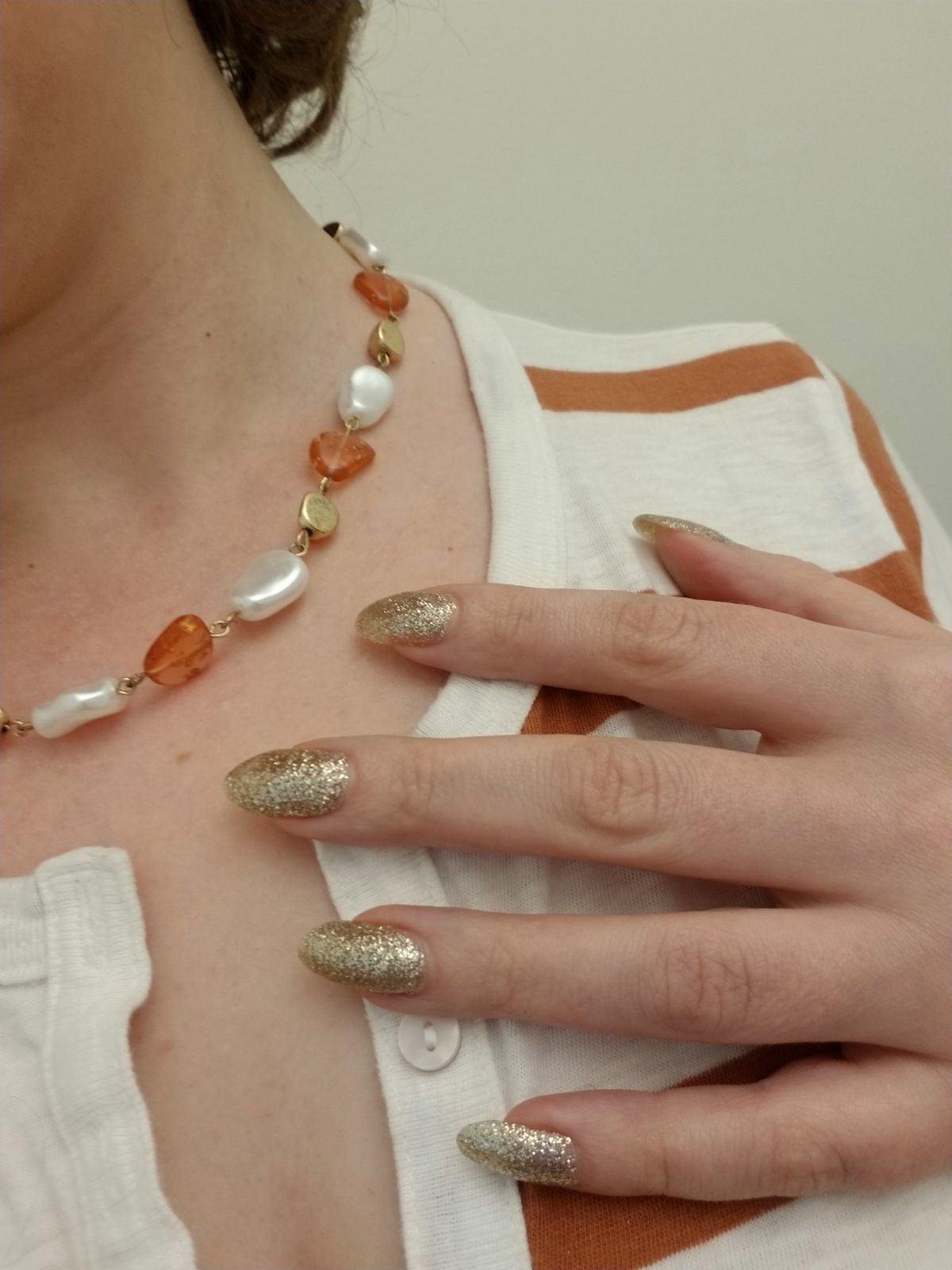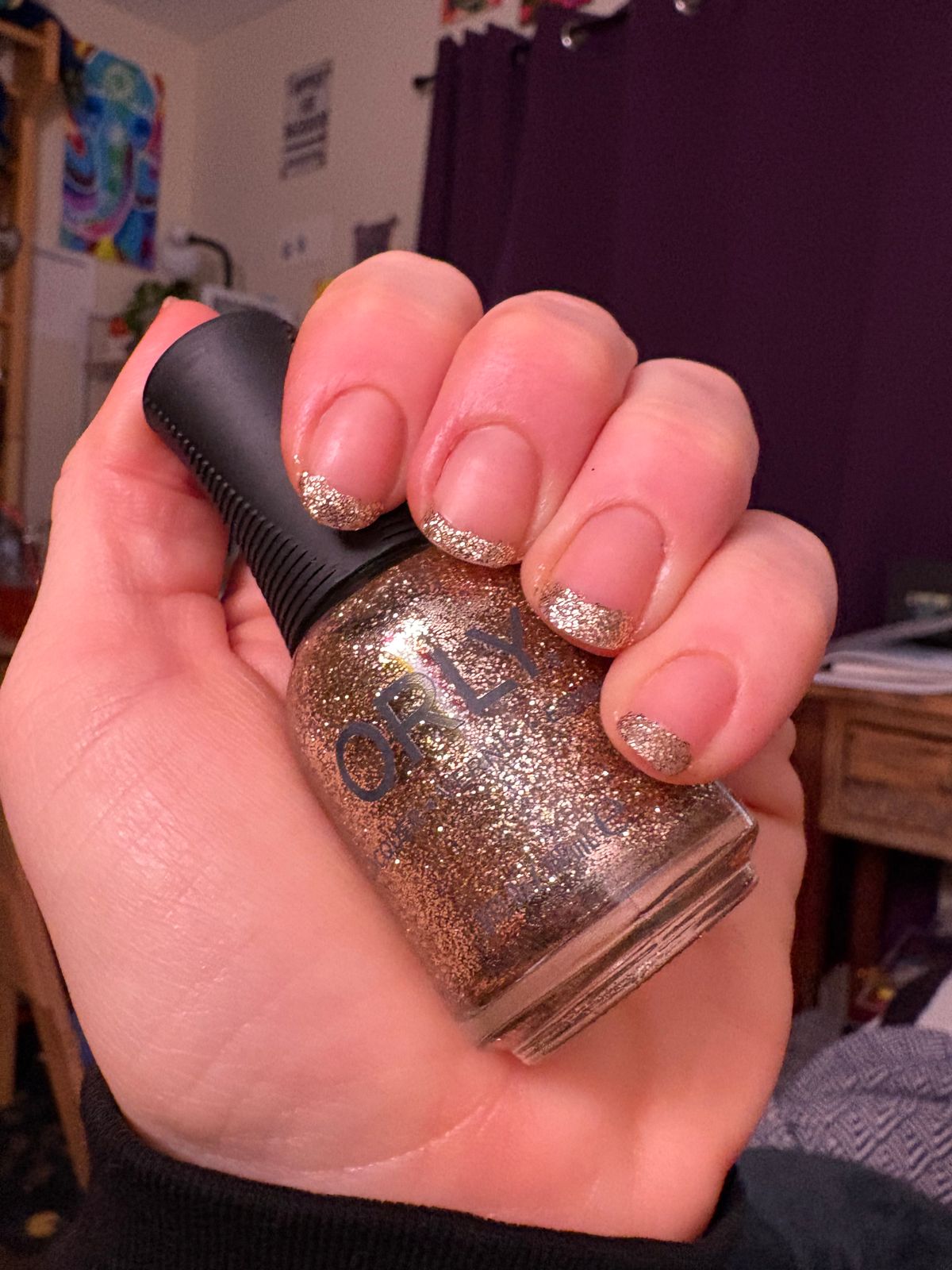 Untouchable Decadence - Nail Lacquer is a luxurious gold glitter with a shimmering finish, offering a rich, warm undertone in a dazzling orange color family.