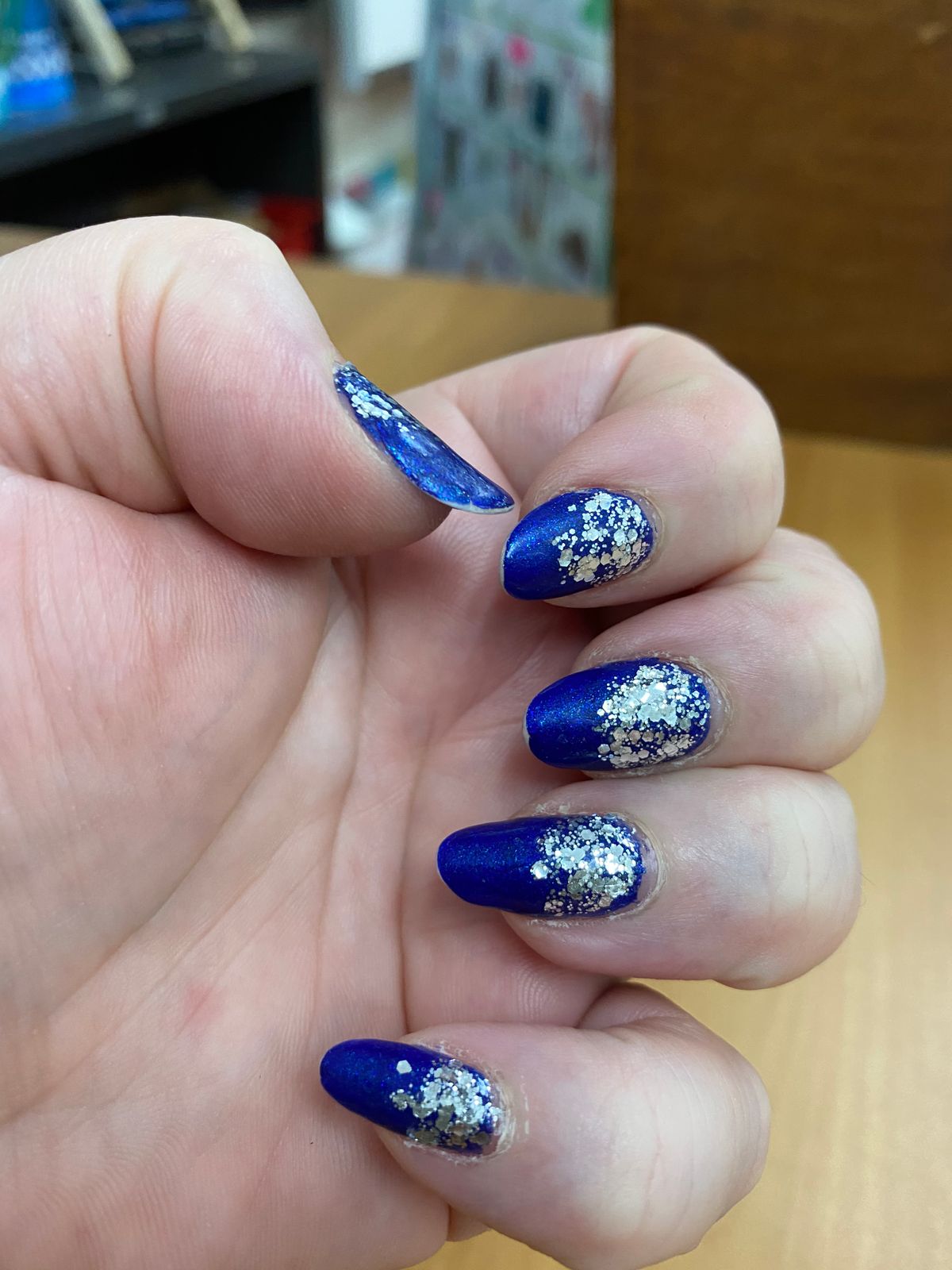 This is a very beautiful shade of blue. The name says it all. It's a mix of royal and navy blue. It has light blue sparkles in it. After a couple of days I added a top coat of Sine On Diamond and it looked like stars twinkling in the night sky. So beautiful!