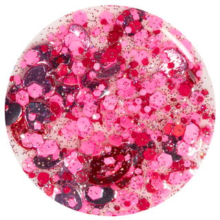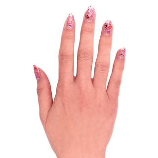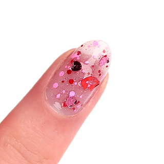• Kiss N Tell - Nail Lacquer is a playful blend of pink and red hues, adorned with sparkly hearts and lip accents, creating a love-inspired, glossy finish.
