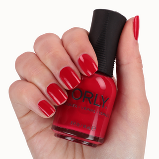 Close-up of red Orly Beauty nail polish being applied to a fingernail with a brush in smooth, even strokes.