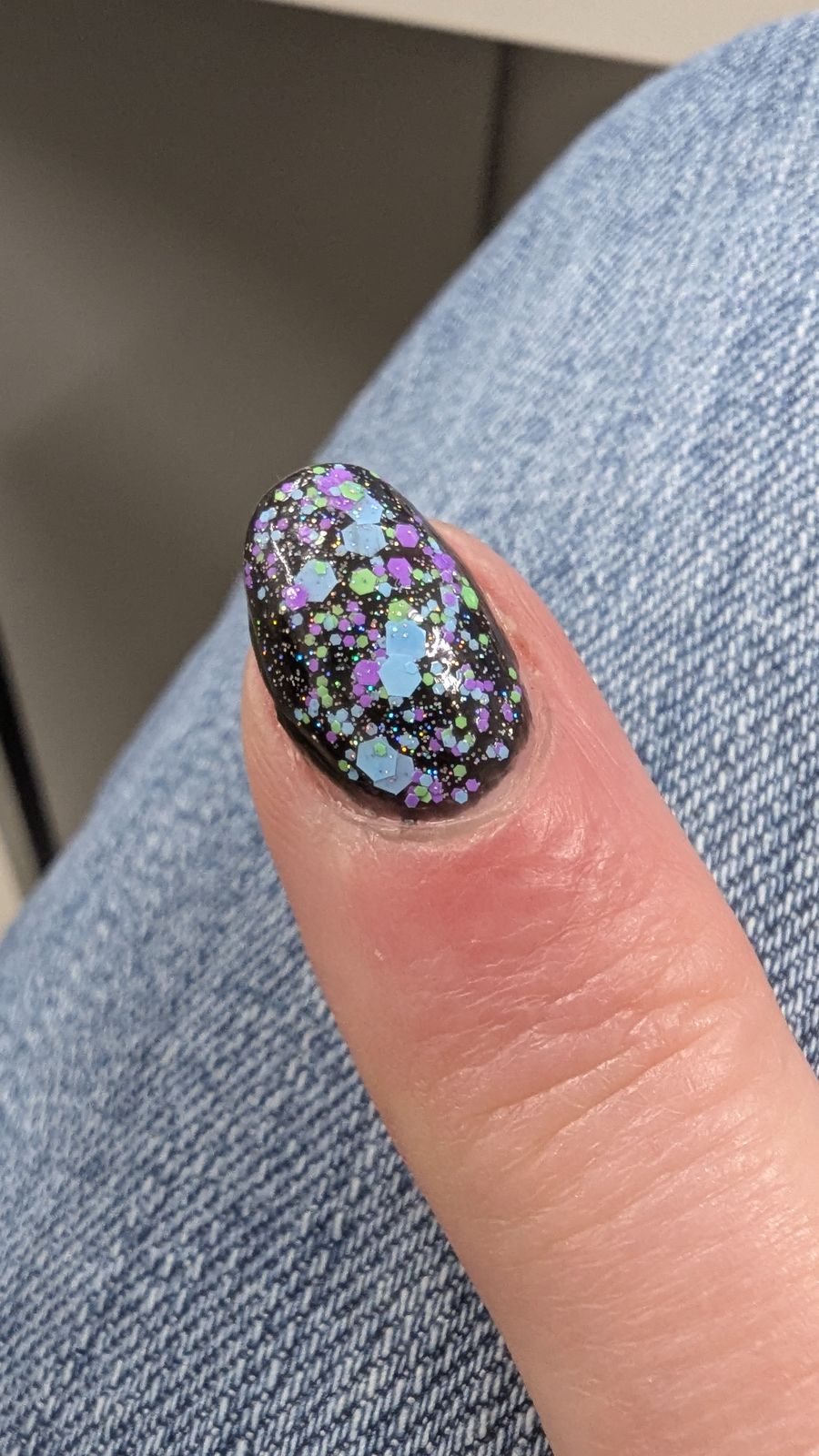 I thought it would look fun over some coordinating colors, but I noticed how bright the truquoise and green spots looked in the sunlight, so i grabbed my little blacklight flashlight, and POW my nails lit up like a rave. Here it is over black polish and the pop is spectacular.